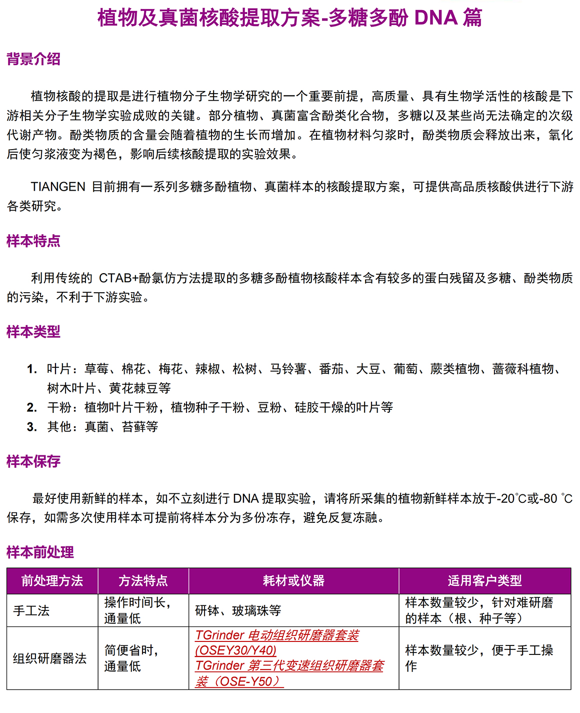 植物核酸的提取是进行植物分子生物学研究的一个重要前提,高质量、具有生物学活性的核酸是下游相关分子生物学实验成败的关键。部分植物、真菌富含酚类化合物,多糖以及某些尚无法确定的次级代谢产物。酚类物质的含量会随着植物的生长而增加。